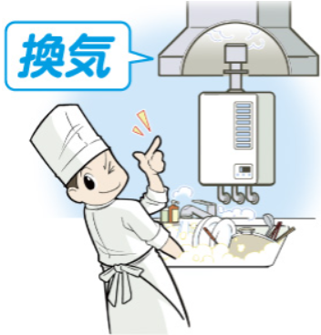- 厨房でガス機器を使用中は、換気扇、排気ファンなどで必ず換気を !!