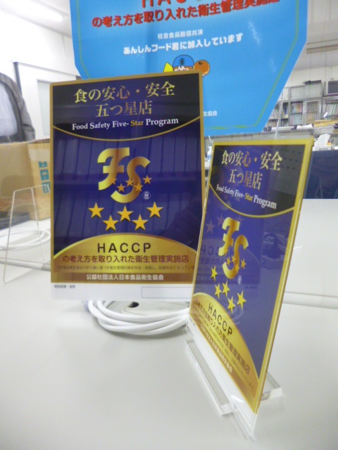 左側写真は、下列がHACCP型の掲示プレート類3種(左:A4判 壁面掲示プレート、中央:ステッカー(シール)、右:A5判 卓上置型プレート)で、上に掲揚された青いフラッグは、あんしんフード君加入者が貰える HACCP型フラッグです。